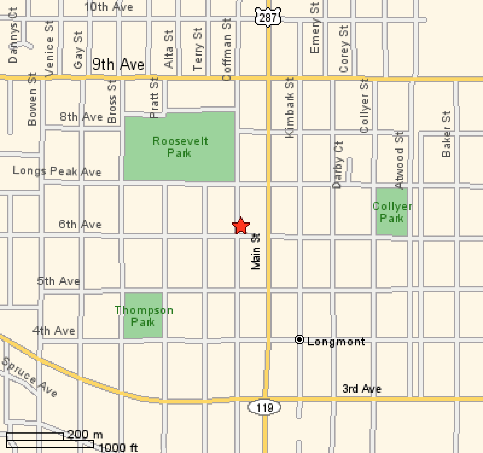 | From the North: Come south on Main Street to Long's Peak Avenue(equivalent to 7th Avenue). Right on Long's Peak one block to Coffman Street. Left on Coffman, ToneWorks Music is 1/2 block up on the left hand side. Parking is available on both sides of the street. |